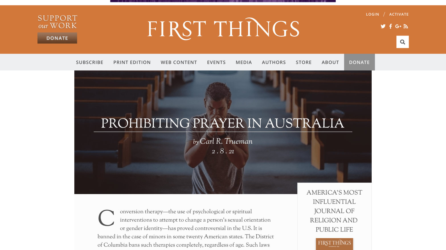 From Carl Trueman, 2.8.21: The legislation also demonstrates one of the oddest results of the modern emphasis on the radical freedom of the individual. In such a world, all must theoretically be allowed to have their own narratives of identity. But because some narratives of identity inevitably stand in opposition to others, some identities mustContinue reading “Prohibiting Prayer in Australia”